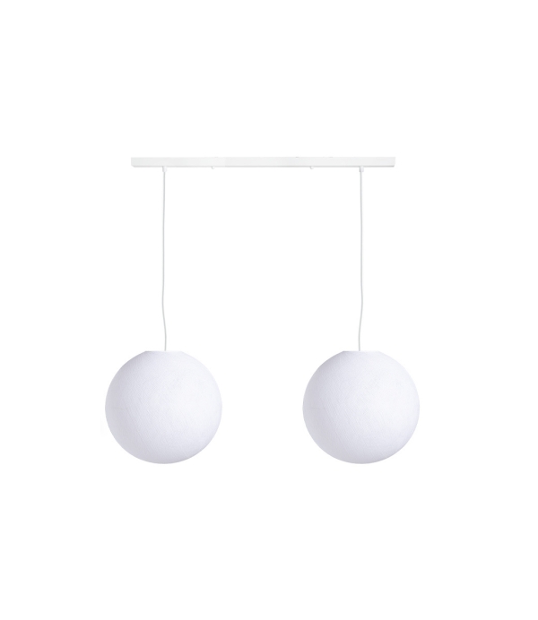 Een sfeervolle tweevoudige hanglamp gevestigd aan een balk met twee cotton lampen, beschikbaar in verschillende kleuren.