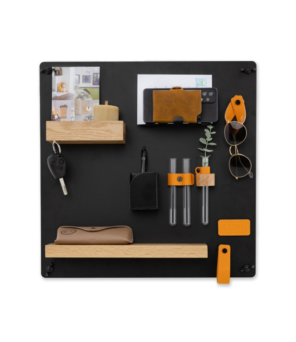 This Dutch-design organizer consists of a smooth black metal plate that can be attached to the wall using the screws (included). The attachments are made using high-quality, powerful, magnets that allow you to move them around and reorganize whenever you like and carry the decorations you put on it.