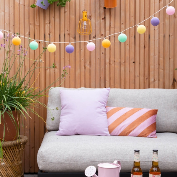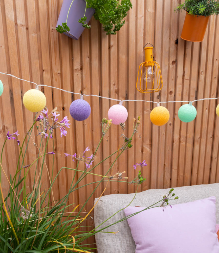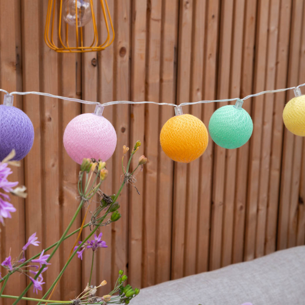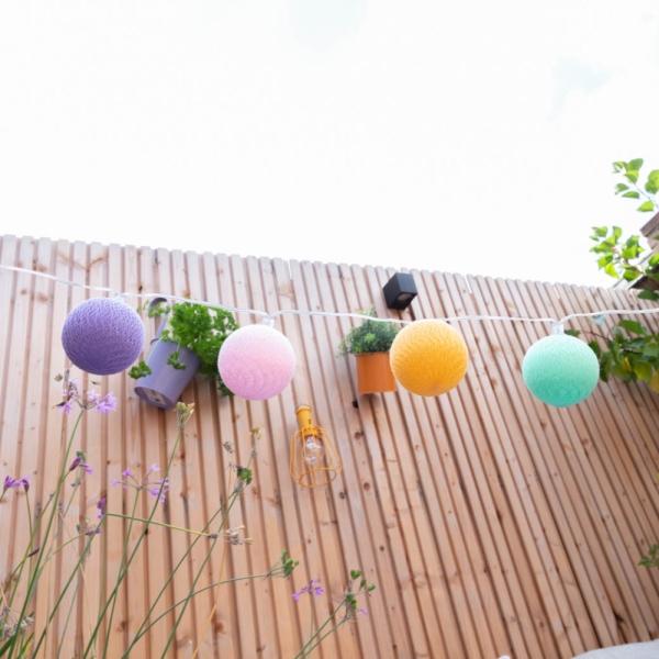 Hang de Cotton Ball Lights buitenlichtslinger in jouw tuin of onder de overkapping en de kleurrijke balletjes creëren direct een gezellige sfeer. Ideaal voor een gezellige zomeravond of tijdens de donkere winterdagen.