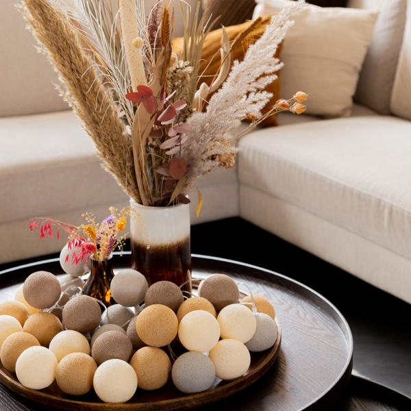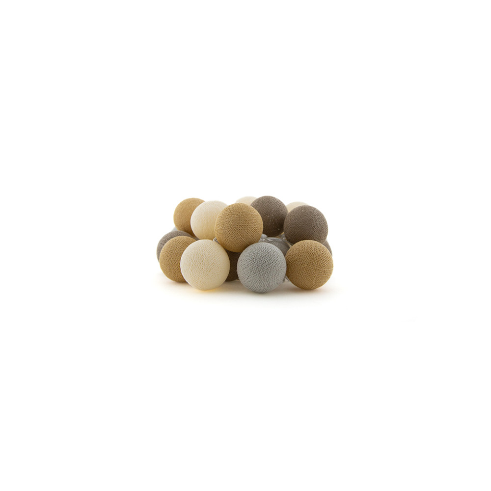Een handgemaakte lichtslinger uit onze Fairtrade-fabriek in Thailand. Deze wintercombinatie bestaat uit een mix van bruin en beige. Deze lichtslinger voegt warmte toe in huis.