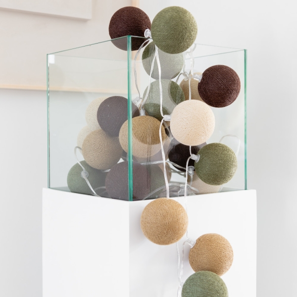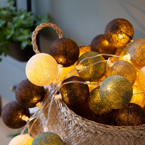 Een handgemaakte lichtslinger uit onze Fairtrade-fabriek in Thailand.Met deze kleurencombinatie heb je mooie aarde tinten in huis die een rustige sfeer met zich mee brengen.